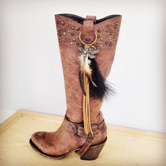 Boho Western Boot Bling Charm Feather & Dragonfly