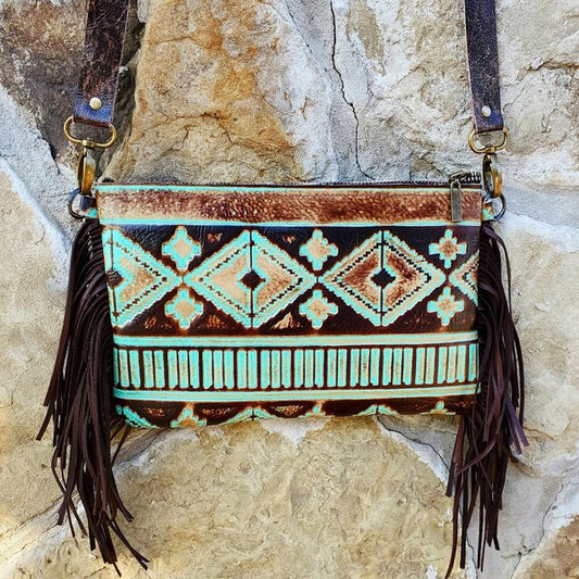 Small Crossbody Handbag Turq Floral Leather Fringe