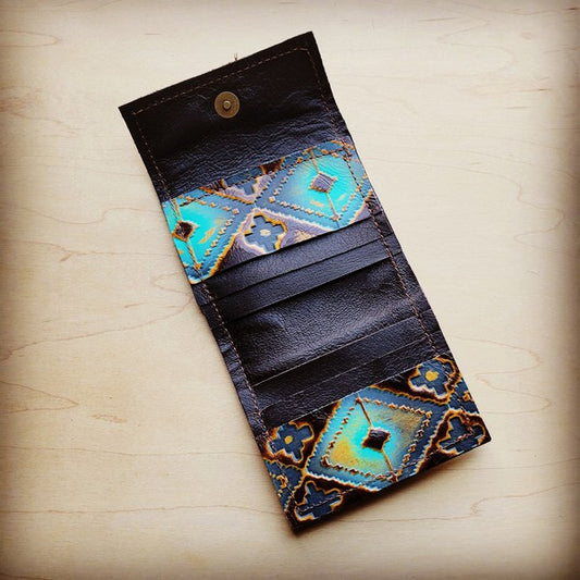 Tri-Fold Embossed Leather Wallet-Blue Navajo