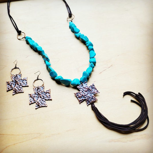 Turquoise Slab Necklace w Genuine Leather Tassel