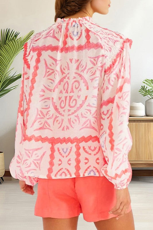 Abstract Poet Collar Smocked Long Sleeve Blouse