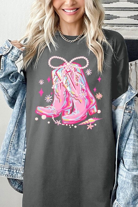 Cowgirl Boots Pearl Bow Graphic Heavy Cotton Tee